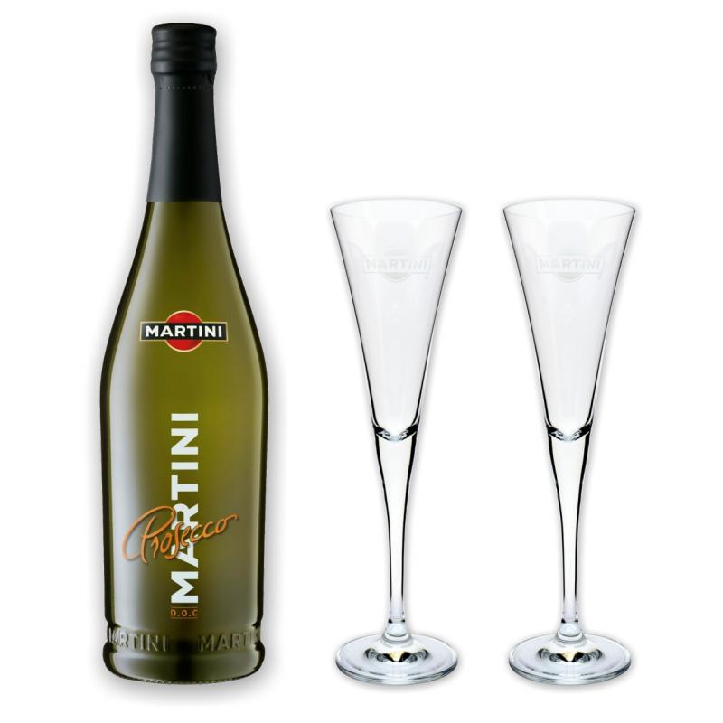Dazu erhalten Sie 2 elegante Kelche in Flötenform mit dem Martini Logo.