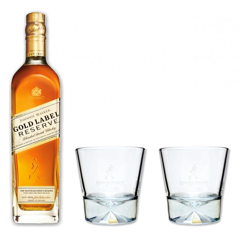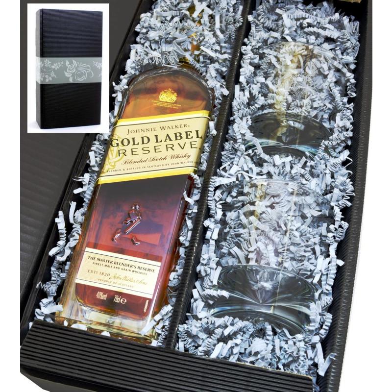 Wir verpacken für Sie 1 Flasche Johnnie Walker Gold Reserve Whisky und 2 originalWhisky Becher mit dem Johnnie Walker Logo in schwerer/stabiler Gastronomiequalität in unseren schönen schwarzen Geschenkkarton von "meinglas24".