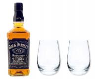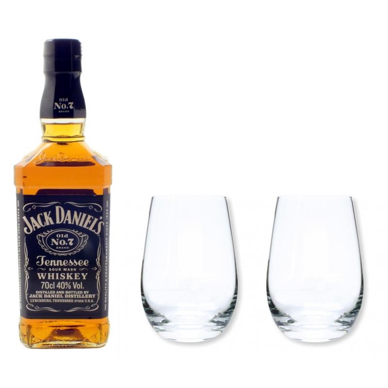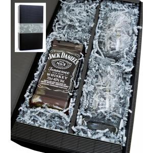 Wir verpacken für Sie 1 Flasche original Jack Daniels Old N°7 in der Black label Edition und 2 Whisky Becher in unseren schönen schwarzen Geschenkkarton von "meinglas24".