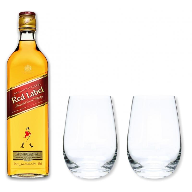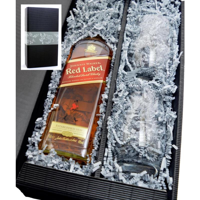 Wir verpacken für Sie 1 Flasche Johnnie Walker Gold ReserveRed Label Whisky und 2 Stölzle Becher in unseren schönen schwarzen Geschenkkarton von "meinglas24".