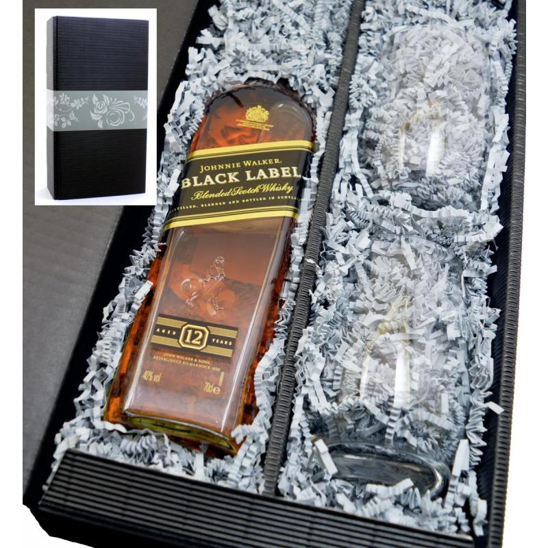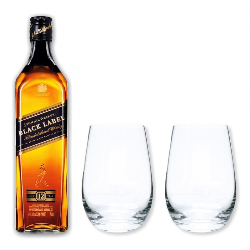 Wir verpacken für Sie 1 Flasche Johnnie Walker Whisky in der Black label Edition und 2 Stölzle Becher in unseren schönen schwarzen Geschenkkarton von "meinglas24".