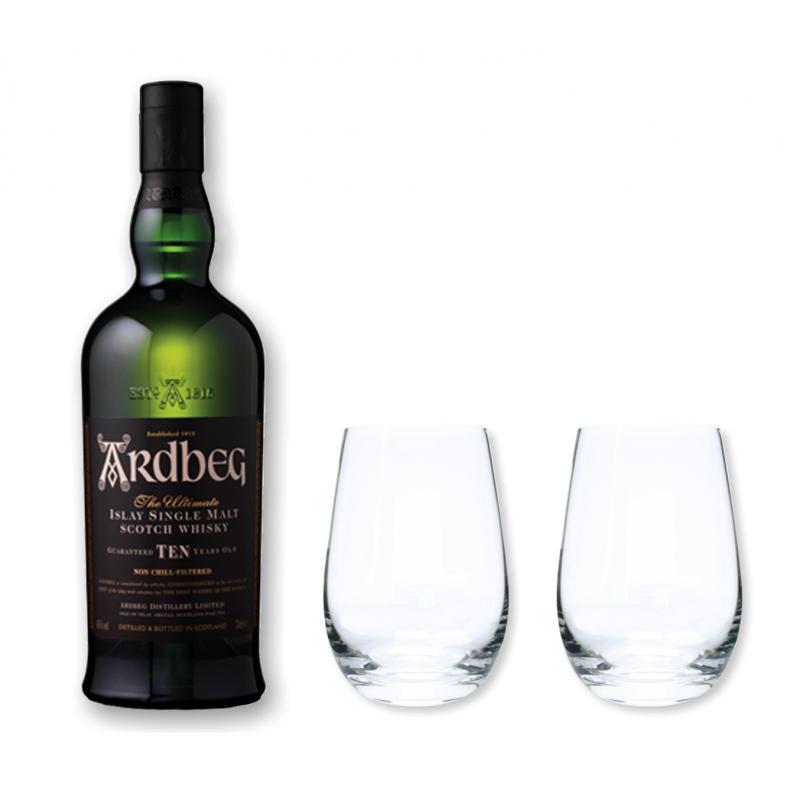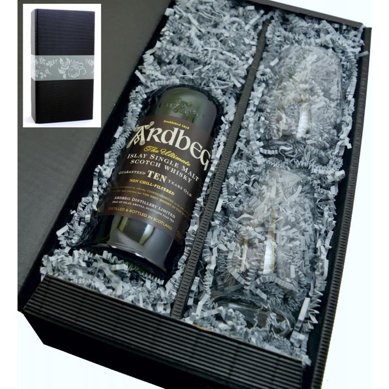 Wir verpacken für Sie 1 Flasche Ardbeg Single Malt Scotch Whisky und 2 Stölzle Gläser in unseren schönen schwarzen Geschenkkarton von "meinglas24".
