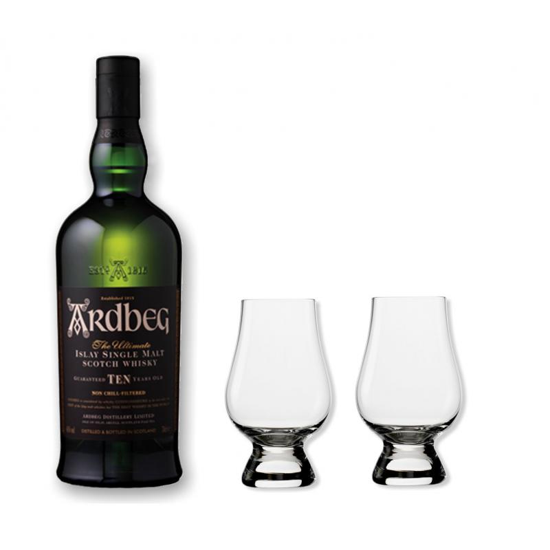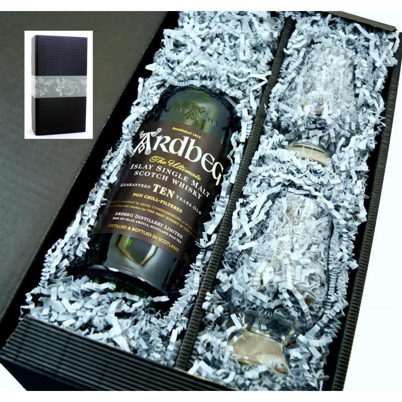 Wir verpacken für Sie 1 Flasche Ardbeg Single Malt Scotch Whisky und 2 Glencairn Gläser in unseren schönen schwarzen Geschenkkarton von "meinglas24".