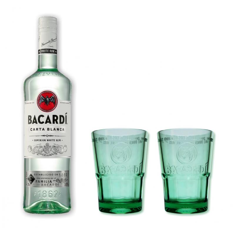 Dazu erhalten Sie 2 original Bacardi Gläser in Tumbler Form.