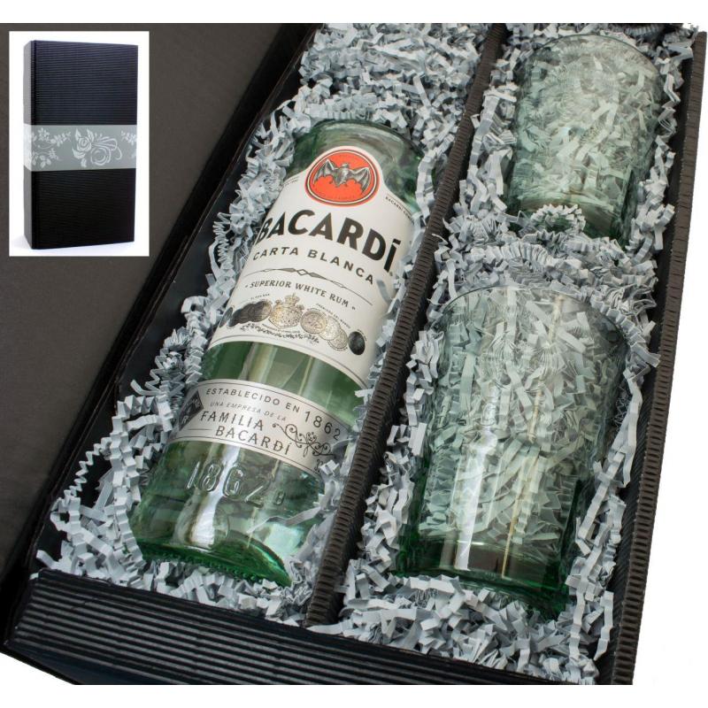 Wir verpacken für Sie eine Flasche Bacardi und 2 original Gläser in unseren schönen schwarzem Geschenkkarton von "meinglas24".