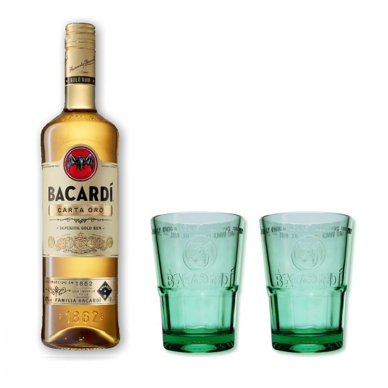Dazu erhalten Sie 2 original Bacardi Gläser in Tumbler Form.