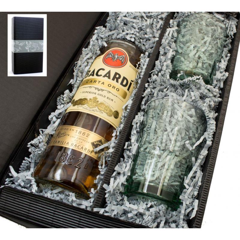 Wir verpacken für Sie eine Flasche Bacardi Carta Oro und 2 original Gläser in unseren schönen schwarzem Geschenkkarton von "meinglas24".