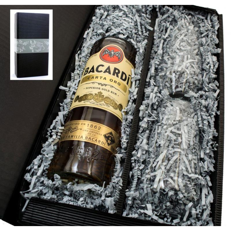 Wir verpacken für Sie eine Flasche Bacardi Carta Oro und 2 Stölzle Revolution Longdrink Gläser in unseren schönen schwarzem Geschenkkarton von "meinglas24".