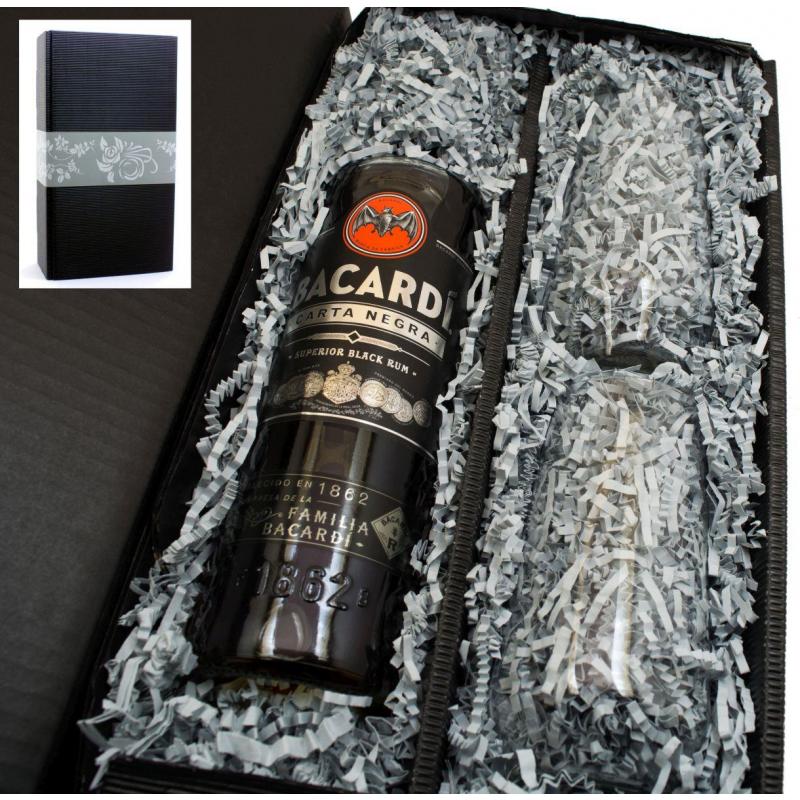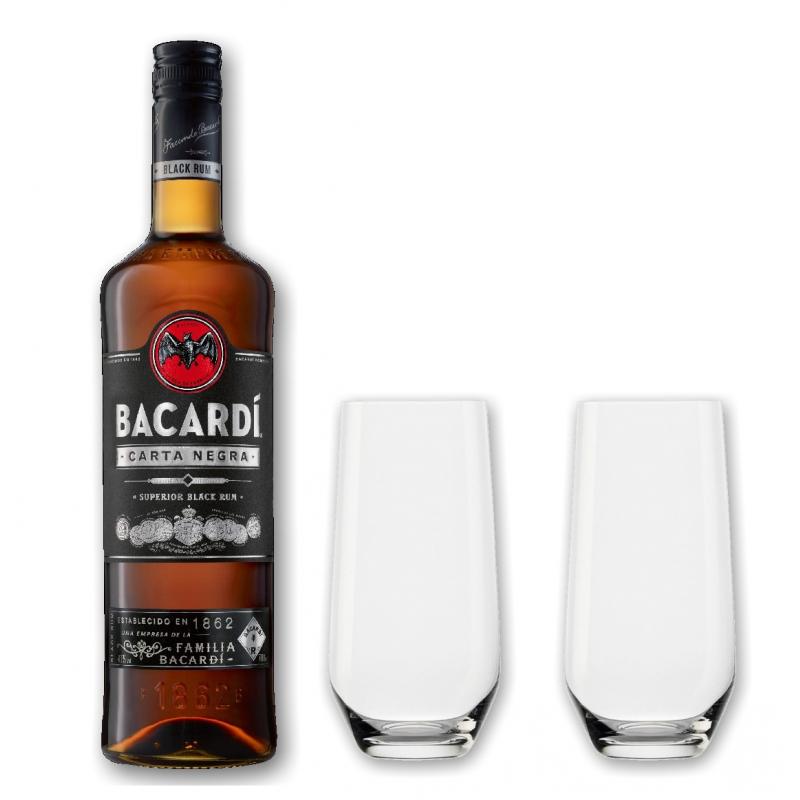 Wir verpacken für Sie eine Flasche Bacardi Carta Negra und 2 Stölzle Revolution Longdrink Gläser in unseren schönen schwarzem Geschenkkarton von "meinglas24".