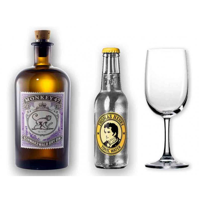 Der Schwarzwald Dry Gin mit 1 Stölzle Kelchglas und 1 Flasche Thomas Henry Tonic Water.