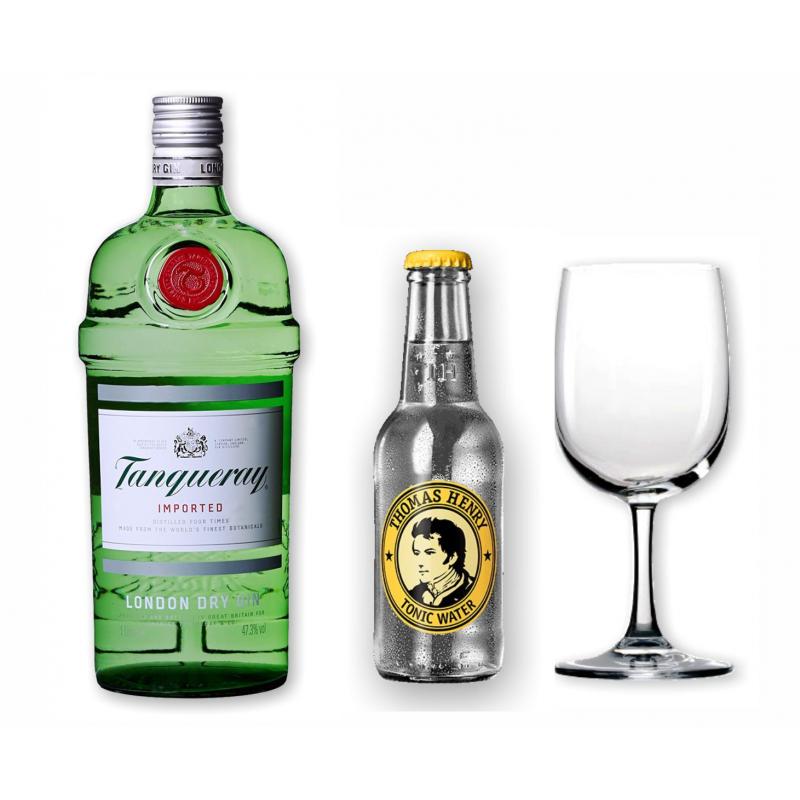 Tanqueray mit 1 Stölzle Kelchglas und 1 Flasche Thomas Henry Tonic Water.