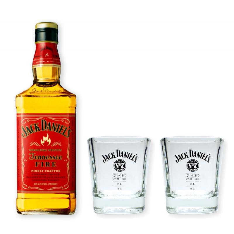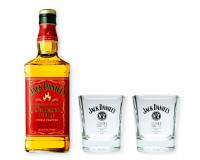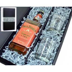 Wir verpacken für Sie 1 Flasche original Jack Daniels Fire Whiskey und 2 Whisky Becher in schwerer/stabiler Gastronomiequalität in unseren schönen schwarzen Geschenkkarton von "meinglas24".