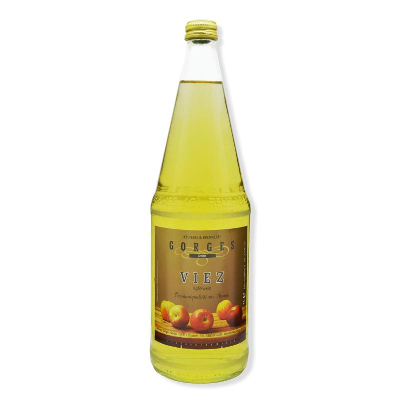 Der herb-saure Apfelwein wird aus kleinen, sehr aromatischen "Viezäpfeln" in der Kelterei Gorges in Thomm bei Trier hergestellt.