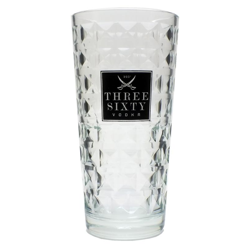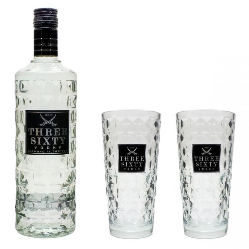 Dazu erhalten Sie 2 Original Three Sixty Wodka Gläser mit dem Logo als Schriftzug und Diamant Optik als Facetten Schliff.
