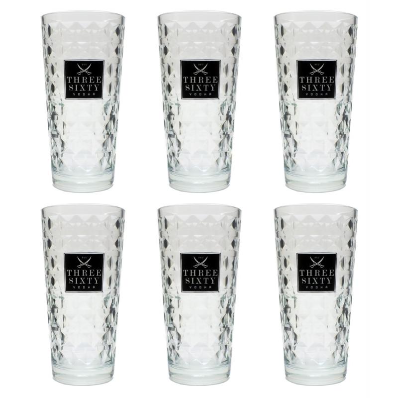 Three Sixty Wodka Gläser mit dem Logo als Schriftzug und Diamant Optik als Facetten Schliff.